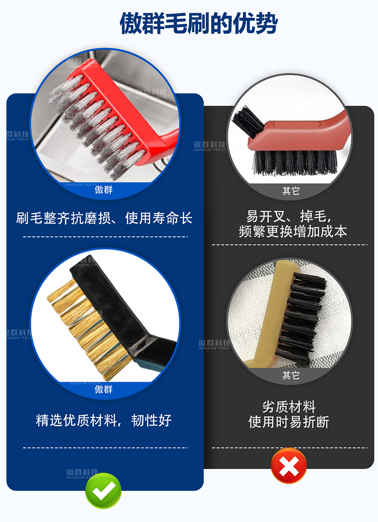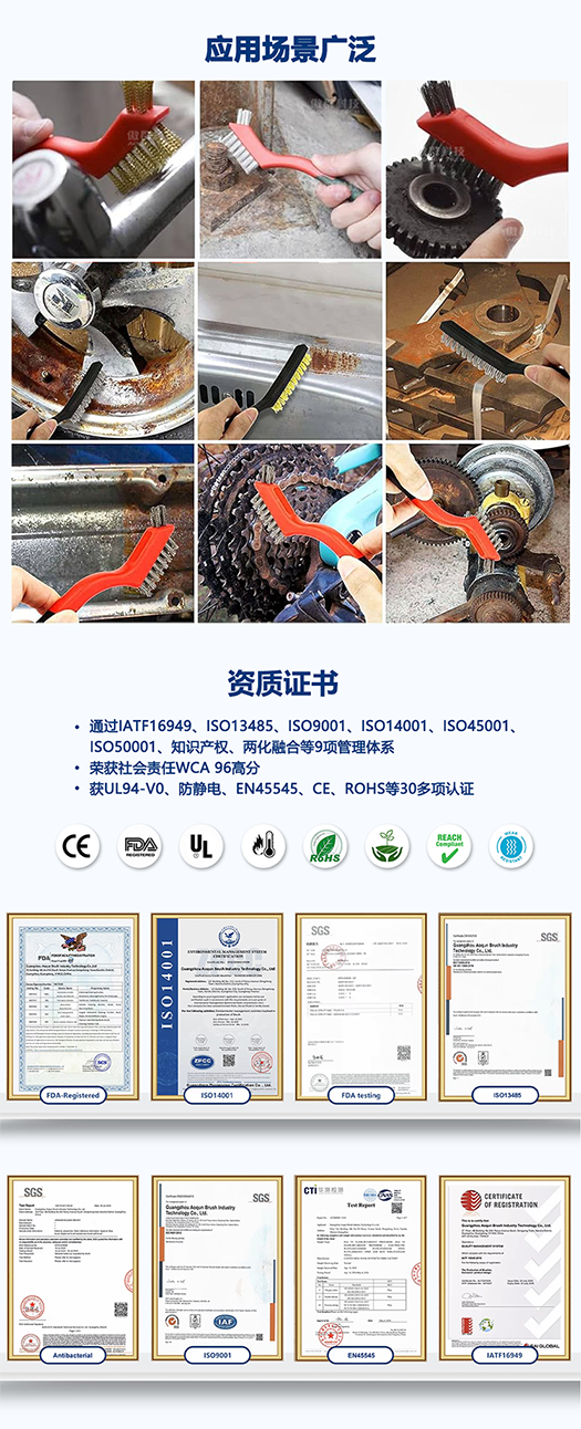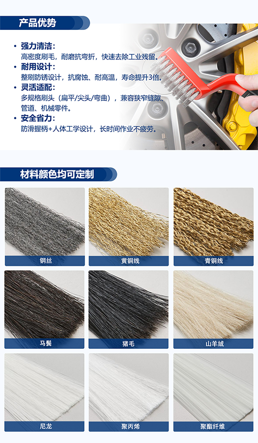 - 刷毛材質(zhì):高密度刷毛耐磨抗彎折,刷毛可選鋼絲、黃銅線(xiàn)、青銅線(xiàn)、馬鬃、豬毛、山羊絨、尼龍、聚丙烯、聚酯纖維等